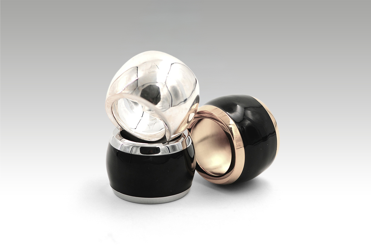 Drei elegante und zeitlose Schalringe. Für die Herstellung wurden in diesem Fall ganz verschiedene Materialien verwendet, nämlich Messing, Sterling Silber und Edelstahl. Diese Materialien wurden aufgrund ihrer Haltbarkeit, Schönheit und Anpassungsfähigkeit für die Beschichtung ausgewählt. Es folgte eine PVD-Beschichtung sowie schwarzem Schleiflack.